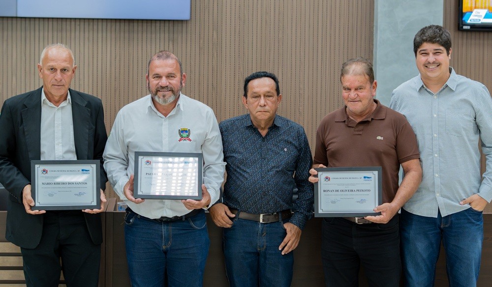 A Câmara Municipal de Franca realizou, na 46ª Sessão Ordinária de 18 de novembro, a entrega de três Moções de Aplausos a lideranças de Ibiraci (MG). As homenagens, propostas pelo vereador Zezinho Cabeleireiro e aprovadas pelo plenário, contemplaram o prefeito Paulo Cézar de Oliveira, o presidente da Câmara de Ibiraci, Mário Ribeiro dos Santos, e o produtor rural Ronan de Oliveira Peixoto. As moções reconheceram o empenho de cada um no desenvolvimento regional, especialmente pela conclusão da ponte que liga Franca a Ibiraci.